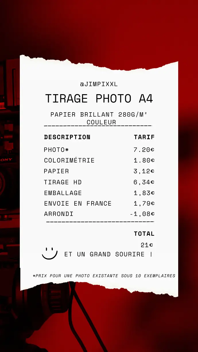 Tirage photo sur format A4, papier brillant, grammage 280, couleur.