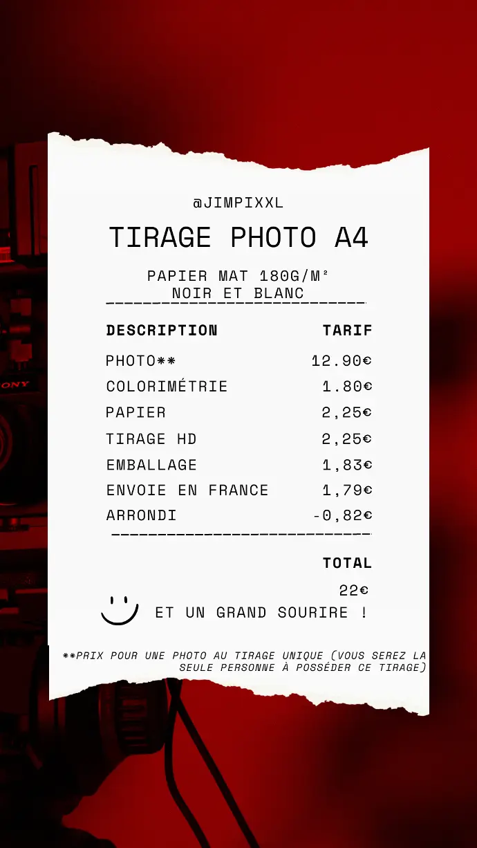 Tirage photo unique sur format A4, papier mat, grammage 180, noir et blanc. Une fois acheter pas d'autres tirages seront produits sur cette photo.